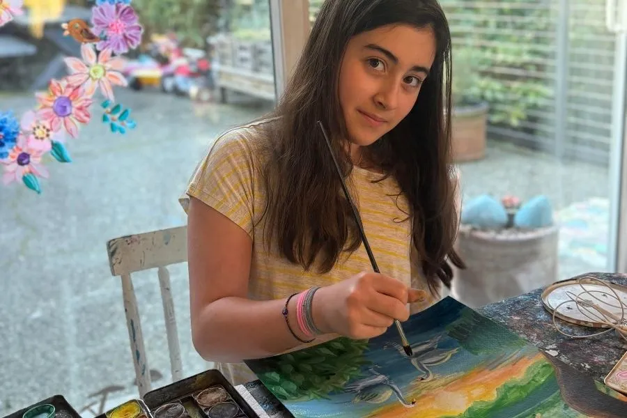 Mira Erdim, age ten, has a schedule worthy of a diplomat. Swimming four days a week, violin practice, vocal lessons, emceeing at Seattle’s International Children’s Friendship Festival, acting—and still, always finding time for art. Mira has been drawing since she was old enough to hold a pencil, each brushstroke marking a clear and colorful voice. Her creations—delicate, vibrant acrylic paintings—reflect a keen observational power surprising for her age.