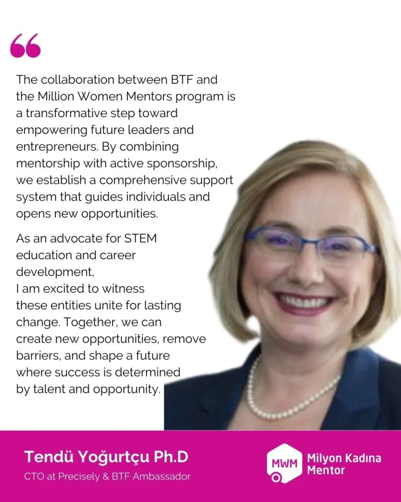 The Milyon Kadına Mentor (Million Women Mentors – MWM) program is a groundbreaking mentorship initiative that connects young women (ages 15-25) with industry leaders to help them achieve their career goals. Launched in 2021 to support careers in STEM, the program expanded in 2023 to include all fields of study—welcoming high school students, university students, and recent graduates.